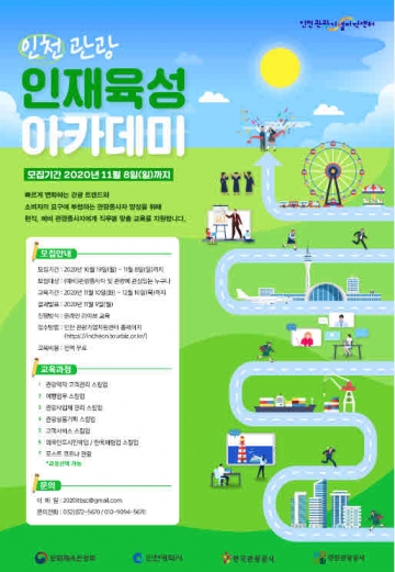 개소를 맞아 인천 관광기업지원센터는 빠르게 변화하는 관광 트렌드와 소비자의 요구에 부합하는 관광종사자 양성을 위해 ‘인천 관광인재 육성 아카데미’를 개설, 11월 10일부터 12월 10일까지 인천 (예비)관광종사자 및 관광산업에 관심 있는 인천시민을 대상으로 아카데미를 진행한다.