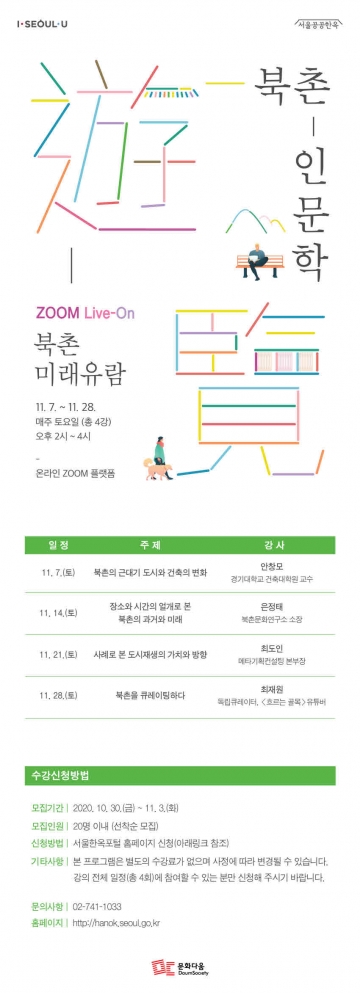 또, 11월 7일(토)부터 매주 토요일 4주간 건축/역사/도시재생/큐레이팅 분야 전문가와 함께 북촌의 인문학적 가치와 내일의 쟁점을 살펴보는 온라인 북촌 인문학 강좌 ‘북촌미래유람’을 화상회의 어플 줌(Zoom)울 통해 실시간으로 진행한다.