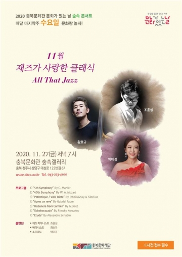 11월 27일(금) 공연은 지난 8월 예정됐던 공연으로 우리나라를 대표하는 재즈피아니스트 조윤성과 최고의 베이시스트 황호규의 무대이다. 많은 유명 뮤지션과의 무대뿐만 아니라 작곡, 편곡 등 왕성한 활동을 하고 있는 재즈피아니스트 조윤성을 청주 무대에서 만나는 행운과 더불어 스페셜 게스트인 소프라노 박미경과의 콜라보도 기대가 되는 공연이다.