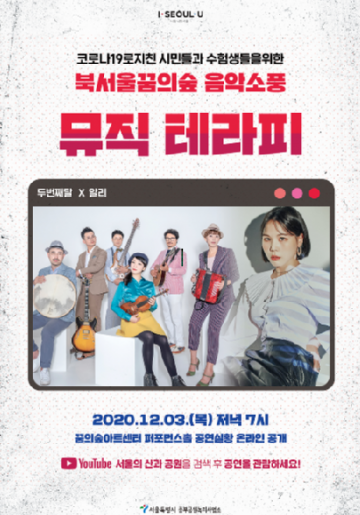 서울시 중부공원녹지사업소는 코로나19 장기화로 인해 우울감을 앓고 있는 시민들과 어렵게 수능시험을 끝마친 수험생들을 위해 12월 3일(목) 저녁 7시 ‘서울의 산과공원’ 유튜브 채널을 통해 온라인 공연 <북서울꿈의숲 음악소풍 ‘뮤직테라피’>를 공개할 예정이라고 밝혔다.