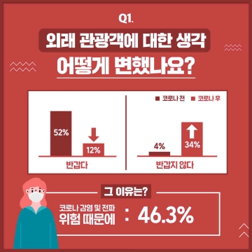 총 1,000명의 서울시민을 대상으로 코로나19 전후 외래관광객에 대한 ‘반가움’의 정도를 조사한 결과, 코로나19 이전 ‘반갑다’ 문항의 응답자가 52%에서 12%로 감소하였으며 ‘반갑지 않다’의 응답자는 4%에서 34%로 증가하였다. 그 이유로는 ‘코로나19 감염 및 전파 위험’이 46.3%를 차지하며 코로나19로 인해 외부인에 대한 거부감이 증가한 것을 수치로 확인하였다.