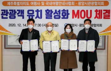 시는 지난 14일 시장 접견실에서 광양시관광협의회(이하 관광협의회)가 제주특별자치도 여행사 및 국내여행안내사협회 회원 등 20여 명을 초청해 협력 네트워크 구축을 위한 MOU를 체결하고 광양 대표 관광지를 홍보했다고 밝혔다.