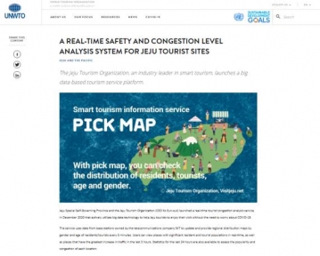 제주특별자치도와 제주관광공사(사장 고은숙)는 최근 ‘실시간 관광지혼잡도분석서비스’ 및 ‘빅데이터 기반 관광서비스 플랫폼’이 UNWTO(세계관광기구) 홈페이지(www.unwto.org/node/11753)에 소개됐다고 13일 밝혔다.