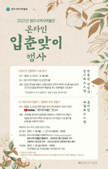 온라인 체험 프로그램은 입춘 당일인 2월 3일 오전 10시 역사박물관 유튜브에 업로드할 예정이며, 관심 있는 원주시민 누구나 무료로 참여할 수 있다.