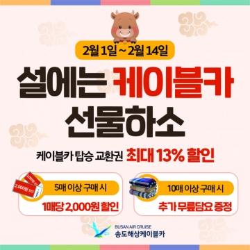 2월 14일까지 이어지는 ‘설에는 케이블카 선물하소’ 이벤트는 송도해상케이블카 탑승권을 장당 2000원 할인된 가격으로 구매할 수 있으며 바닥이 투명한 크리스탈 캐빈은 10%, 바닥이 불투명한 에어크루즈 캐빈은 13% 할인을 받게 된다.