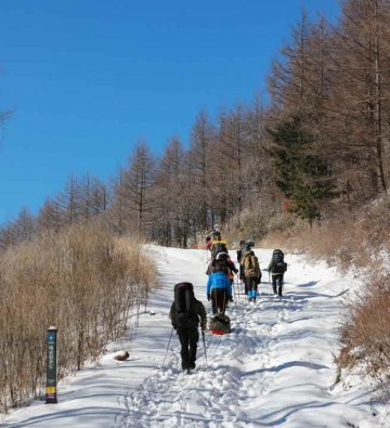 하늘 위로 곧게 뻗은 나무와 어우러지는 눈길을 걸으며 겨울의 정취를 만끽하고, 내리막이 나타나면 막간을 이용해 눈썰매를 즐길 수 있는 것이 이번 챌린지의 묘미다.