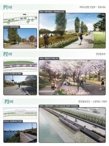 콘크리트로 덮여있던 여의나루역~원효대교 강변길은 흙과 돌 같은 자연 소재로 이뤄진 공원 속 녹색길이 된다. 바로 맞닿아있어서 보행자에게 위험했던 보행로와 자전거길 사이에는 띠 녹지가 조성돼 쌩쌩 달리는 자전거와 보행자가 안전하게 분리된다. 여의도한강공원에서 샛강으로 이어지는 넓은 길에는 벚나무를 추가로 심어 매년 봄 벚꽃이 만개하는 명소로 재탄생시킨다.
