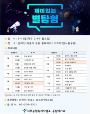 서울시(서부공원녹지사업소, 남길순소장)는 노을공원에 있는 노을별누리(별자리 교육장)에서 “재미있는 별자리 여행” 온라인 프로그램을 운영한다고 밝혔다.