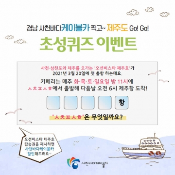 사천시시설관리공단(이사장 박태정)은 2021년 3월을 맞아 오는 4일부터 14일까지 ‘경남 사천바다케이블카 찍고~ 제주도 Go! Go!’ 초성퀴즈 이벤트를 진행한다.