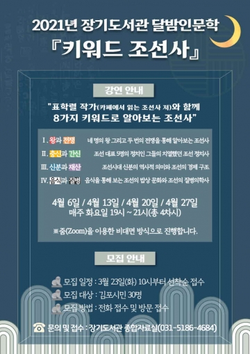 김포시 장기도서관은 2021년 4월 6일부터 4월 27일(매주 화요일) 오후 19시부터 21시까지 총 4회에 걸쳐 김포 시민을 대상으로 「키워드 조선사」 강연을 운영한다.
