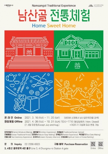 서울시는 충무로역에 위치한 서울의 명소 ‘남산골한옥마을’에서 포스트 코로나 시대에 맞춰 온라인과 현장에서 모두 즐길 수 있는 ‘남산골 전통체험’을 오는 3월 16일(화)부터 시작한다고 밝혔다.