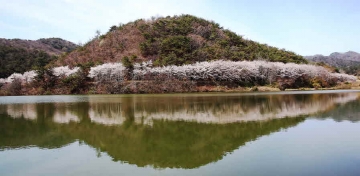 벚꽃과 숲이 저수지 수면에 함께 투영되면서 환상적인 풍광이 연출되고 있다.