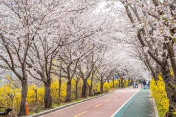 봄이면 풍납중학교에서 아산병원까지 이어지는 1km 남짓의 성내천 둑길이 꽃길로 변한다. 산책로 양옆으로 벚꽃이 드리우면서 벚꽃 터널을 만들고, 벚꽃 아래는 노란 개나리까지 어우러져 환상적인 꽃길이 된다. 산책로와 자전거 도로가 함께 있어 사진을 찍을 땐 오가는 자전거를 주의해야 한다. 여유가 있는 사람이라면 성내천 산책로를 따라 올림픽공원을 지나 성내 4교까지 가보도록 하자. 길 중간중간마다 숨겨놓은 보물처럼 벚꽃이 나타난다.