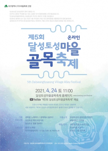 축제는 24일 11시부터 유튜브『제5회 달성토성마을 골목축제』채널과 『달성토성마을』홈페이지를 통해 시청할 수 있다.
