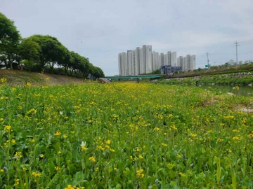 유채꽃이 피어난 위천천 하천둔치는 돌무지로 한낮에는 금세 뜨거워져 물기를 머금기 어려워 스프링클러를 설치했으며, 거름기가 없는 척박한 하천바닥에 비료를 주고 갈대와 잡초를 제거하는 노력 끝에 노란 물결의 유채꽃이 만발해 잔잔한 감동을 주고 있다.