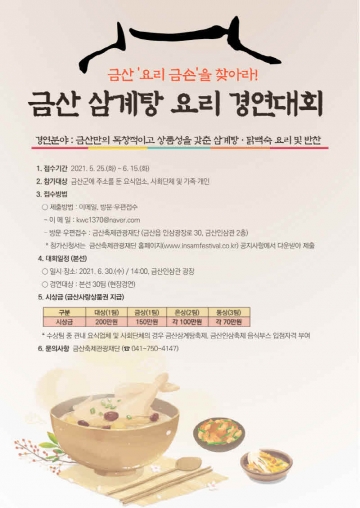 이번 대회는 제1회 금산 삼계탕축제를 앞두고 차별화된 삼계탕과 닭백숙 요리를 개발하기 위해 추진되며 (사)한국조리사협회중앙회 충남·세종지회에서 함께한다.