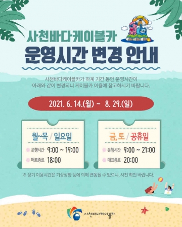 변경된 운영시간에 대한 자세한 사항은 사천바다케이블카 홈페이지(www.scfmc.or.kr/cablecar) 또는 고객센터(055-831-7300)에서 확인할 수 있다.