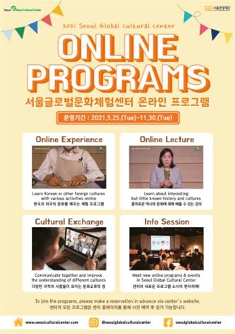 서울글로벌문화체험센터는 코로나19로 위축된 내외국인 문화교류를 장려하기 위해 11월까지 매주 다른 콘텐츠의 온라인 프로그램을 운영한다. 크게 온라인 문화체험, 온라인 강의, 온라인 문화교류, 온라인 설명회 4가지 형태로 프로그램이 구성되어 있으며, 이를 통해 각국의 문화 콘텐츠를 집에서도 편히 경험할 수 있도록 할 예정이다. 자세한 프로그램 내용과 참여 방법은 서울글로벌문화체험센터 SNS 및 홈페이지(www.seoulculturalcenter.com) 통해 확인할 수 있다.