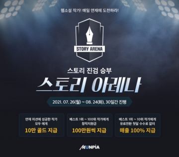 웹소설 연재 플랫폼 문피아가 웹소설 작가의 창작 활동을 지원하기 위해 7월 26일부터 8월 24일까지 30일간 ‘스토리 아레나’를 진행한다.
