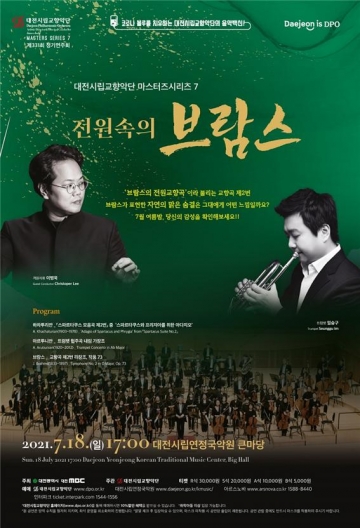 대전시립교향악단은 7월 18일(일) 마스터즈시리즈 7을 대전시립연정국악원에서 이병욱의 객원지휘로 연주한다.