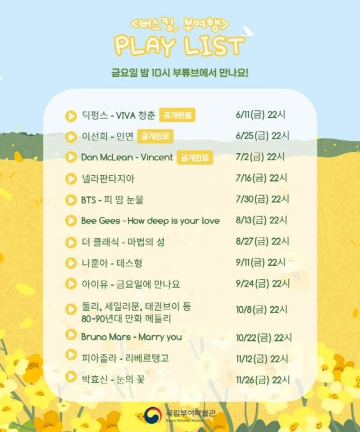 국립부여박물관은 올해 11월까지 매달 금요일 10시에 ‘나훈아 테스형’·‘BTS 피땀눈물’·‘아이유 금요일에 만나요’·‘박효신 눈의 꽃’ 등 곡들을 가야금·첼로·해금 등을 통한 다양한 연주로 부튜브에서 공개할 예정이다.