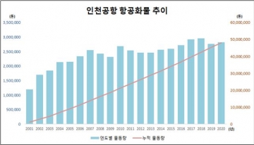 ‘01년 120만 톤이였던 인천공항 항공화물 물동량은 매년 실적이 점차 개선되면서, ’07년 255만 톤(‘01년 대비 113% 증가)까지 기록하였으나 ’08년 미국 금융위기 여파로 물동량이 ‘09년 231만 톤까지 하락(’07년 대비 △9% 감소) 후 전세계 경기가 점차 회복되면서 ‘18년에는 개항 후 최고 실적인 295만 톤을 달성하는 등 소폭의 등락을 거듭하면서도 전반적인 실적은 상승 추세에 있다.