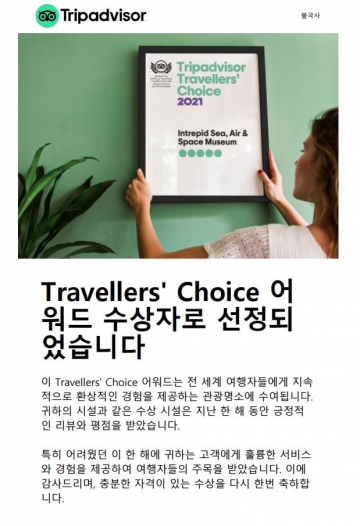 전세계 1위 여행전문 사이트 트립어드바이저(Tripadviser)는 매년 약 9억여 건의 여행자들의 긍정적인 리뷰와 의견을 기반으로 전세계 상위 10%의 우수한 여행지를 선정하여 ‘트래블러스 초이스 어워드(전세계 여행자 선정 관광지)’를 발표한다. 그 중 유네스코 세계문화유산인 불국사가 2021년 ‘트래블러스 초이스 어워드’에 선정되는 기쁨을 누렸다.