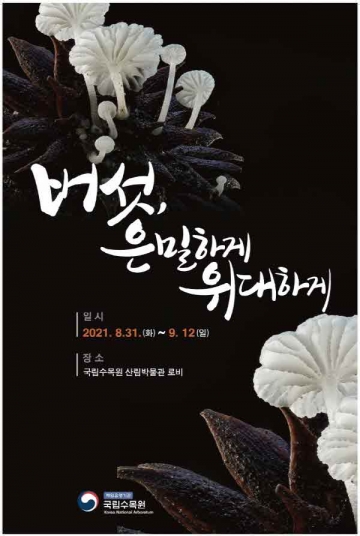 산림청 국립수목원(원장 최영태)은 경기도 포천시 소재 국립수목원 내 산림박물관 1층에서 가을철 버섯 발생 성수기를 맞아 우리나라에 자생하는 버섯을 바탕으로 「버섯특별전시회 - ‘버섯, 은밀하게 위대하게’」를 개최한다고 밝혔다.