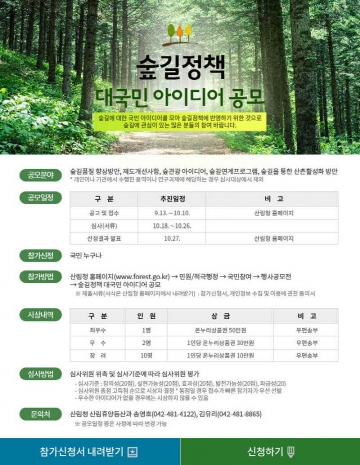 * 응모방법 : 산림청 누리집(www.forest.go.kr) → 민원/적극행정 → 국민참여 → 행사공모전 → 숲길정책 국민 아이디어 공모(내용은 200자 이상 작성)