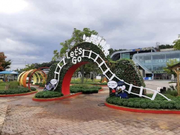 정원역 광장 가을정원의 첫 입구 공간은 여행의 시작을 알리는 맞이장소로 기차역 분위기의 화려한 꽃조형물과 기차역장 복장을 한 순천 캐릭터들이 관람객을 맞이하는 모습으로 가을을 대표하는 국화와 억새 등을 식재하여 낭만 가득한 정원을 연출했다.