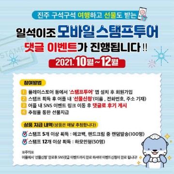 참여 방법은 휴대폰에서 ‘스탬프 투어’앱(애플리케이션)을 설치하고, 앱에서‘진주시 모바일 스탬프 투어’를 선택한 후, 진주시가 지정한 스탬프 존으로 이동해 자동으로 부여되는 스탬프를 모으면 된다.