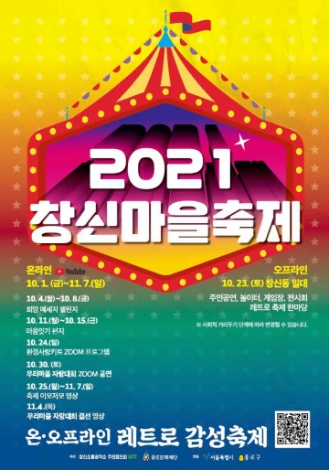 종로구(구청장 김영종)는 10월 1일(금)부터 한 달여간 지역주민과 손잡고 「2021 창신마을축제」를 개최한다. 주민 문화향유 기회를 확대하기 위해 온오프라인을 무대로 각종 공연, 전시, 체험 프로그램을 선보이는 자리이다.