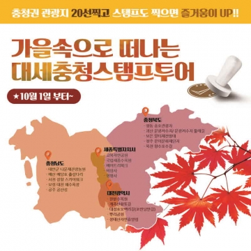 충청북도와 충청권관광진흥협의회(이하 협의회)는 충청권 관광지 20곳을 선정해 오는 10월 4일부터 11월 30일까지 충청권 ‘가을 속으로 떠나는 대세충청 스탬프 투어’ 이벤트를 공동 실시한다.
