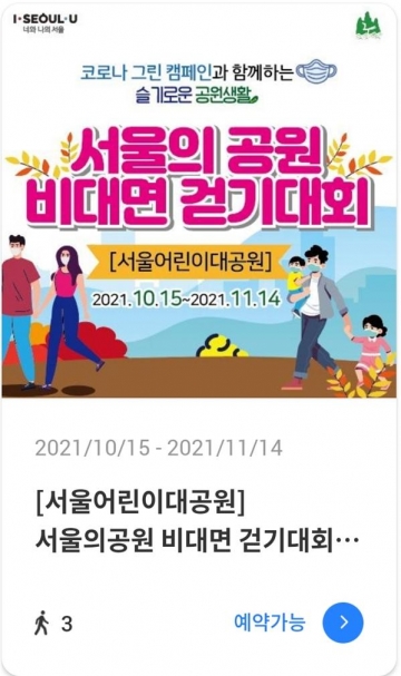 서울시는 단풍이 물드는 가을철을 맞아 공원을 걷고 사진전과 단풍을 보며 힐링할 수 있도록 주요공원에서 비대면 걷기대회와 사진전을 10월 15일부터 11월 14일까지 한 달간 개최한다.