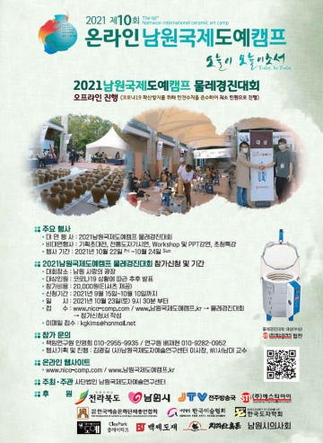 제10회 남원국제도예 캠프가 10월 23일부터 24일 사랑의 광장과 온라인 플랫폼으로(www.nica-camp. com / www. //남원국제도예캠프. kr) 개최된다. 사단법인 남원국제도자예술연구센터 (이사장 김광길)가 주최하고 전라북도와 남원시에서 후원하는 이번 캠프는 코로나19 확산 방지를 위해 온라인과 오프라인 투트랙으로 진행되며, 그리스•스페인•일본•미국•중국•영국•터키 등 14개 국가 127명의 작가가 참여하여 전 세계의 다양한 도자 작품들을 선보인다.