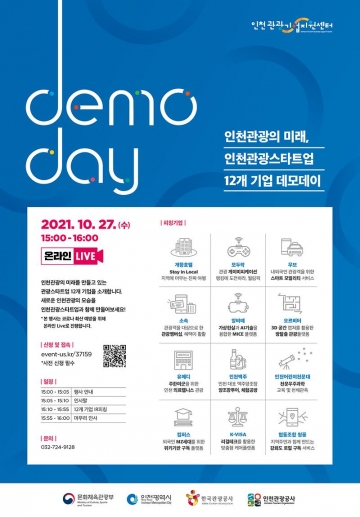 인천광역시(시장 박남춘)와 인천관광공사(사장 민민홍)는 2021년 인천관광스타트업 공모를 통해 선정된 12개 기업의 사업 소개를 위한「인천관광스타트업 데모데이」를 10월 27일(수) 15시부터 온라인 생중계를 통해 진행한다고 밝혔다.