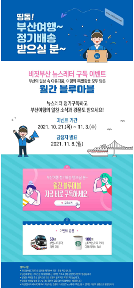 부산광역시(이하 부산시)와 부산관광공사(이하 공사)는 부산관광포털 비짓부 산의 뉴스레터‘월간 블루마블’창간을 앞두고 정기 구독자 모집 이벤트를 오는 11월 3일까지 실시한다고 밝혔다.