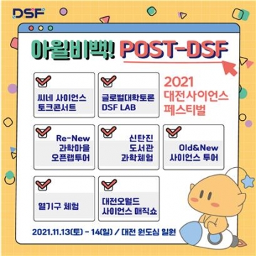 대전마케팅공사(사장 고경곤)는 오는 11월 13일부터 14일까지 ‘2021 대전사이언스페스티벌’의 후속 행사 ‘포스트 대전사이언스페스티벌’을 대전 일대에서 개최한다고 밝혔다.