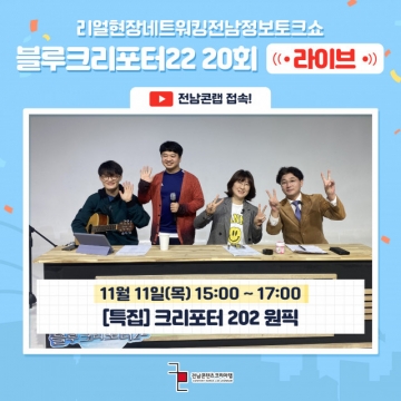 전남도청 대변인실과 전남정보문화산업진흥원 전남콘텐츠코리아랩이 전라남도 22개 시·군의 지역 크리에이터 활성화를 위해 3월부터 공동 제작 중인 ‘더 라이브 블루크리포터22’가 11일 마지막 방송(20회)으로 대단원의 막을 내렸다.
