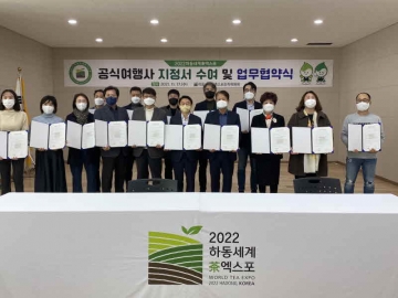 하동세계차엑스포조직위원회(위원장 하병필 권한대행)는 17일 화개면사무소에서 공식여행사 지정서 수여식 및 업무협약을 체결하고 1박 2일 일정으로 팸투어를 실시했다고 밝혔다.