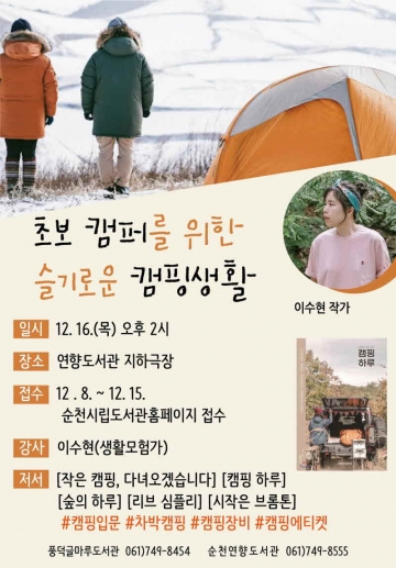 순천시 도서관운영과 관계자는 “이번 강연은 캠핑인구 700만 시대를 맞아 올바른 캠핑정보를 제공하고, 코로나19로 지친 시민들의 심신을 캠핑의 감성으로 치유하기 위해 특별히 마련했다.”고 전했다.