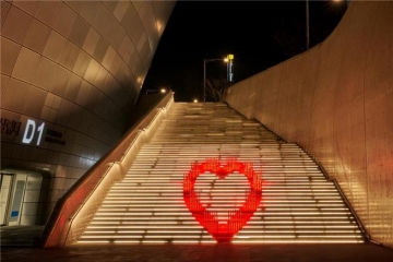 DDP(동대문디자인플라자) 어울림마당 계단 한가운데 빨간색 하트모양의 바닥그림이 설치됐다. 하트를 따라 시민들이 오가며 잠시 쉴 수 있는 빨간색 벤치 10개도 생겼다. 밤이 되면 의자에 조명이 켜져 화려하고 따뜻한 분위기를 자아낸다.