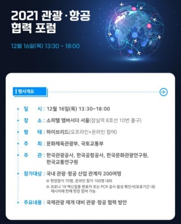 국토교통부(장관 노형욱, 이하 국토부)와 문화체육관광부(장관 황희, 이하 문체부)는 12월 16일(목) 오후 1시 30분 서울 소피텔 앰버서더 호텔에서 ‘2021 관광-항공 협력 포럼’을 개최한다.