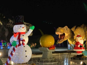 야외 공룡동산에는 반짝이는 조명들이 불을 밝히고, 산타와 루돌프가 공룡들과 함께 전시되어 있어 크리스마스 분위기를 미리 느껴볼 수 있다.