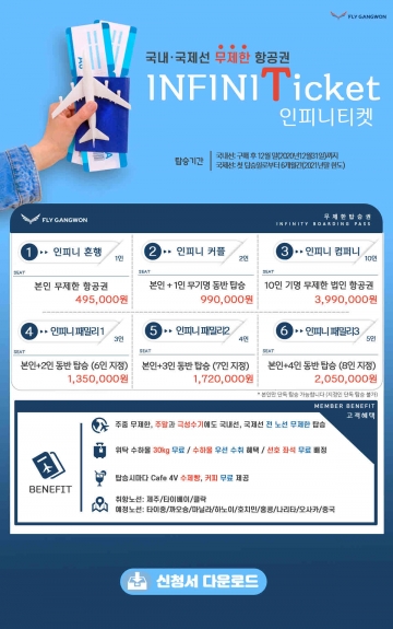 ‘인피니 티켓’은 항공 회원권 개념의 프로모션으로 플라이강원이 취항하는 전 노선을 패키지 성격에 따라 6개월간 무제한으로 사용 가능한 티켓이다.