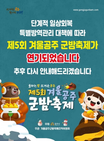 공주시에 따르면, 겨울공주군밤축제 조직위원회는 최근 긴급회의를 열고 행정안전부 및 충청남도의 방역 지침에 따라 축제를 연기하기로 결정했다고 4일 밝혔다.