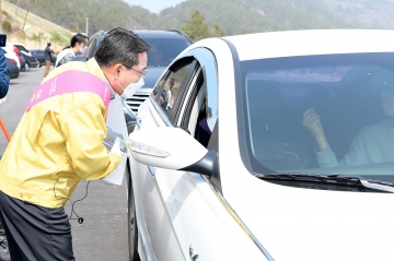 여수시(시장 권오봉)가 코로나19로 경영난에 빠진 양식어가 피해 최소화를 위해 21일부터 드라이브스루 활어회 판매에 나선 가운데 22일 오전 권오봉 여수시장이 판매장을 방문해 직접 활어 판매에 나섰다.