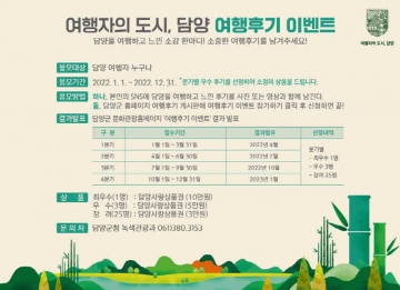 자세한 내용은 담양군 문화관광 누리집 ‘여행후기 이벤트’ 게시판에서 확인할 수 있다.