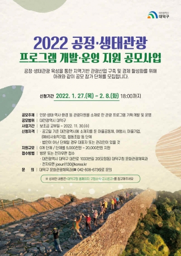 대전 대덕구(구청장 박정현)는 27일부터 다음달 8일까지 ‘2022년 공정생태관광 프로그램 개발·운영 지원 사업(이하 공모사업)’ 지원 단체를 모집한다.