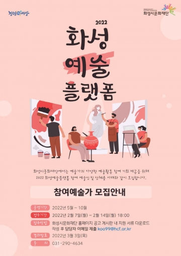 (재)화성시문화재단은 오는 2월 7일부터 14일까지 ‘2022 화성예술플랫폼’ 사업에 참여할 예술인을 공모한다.